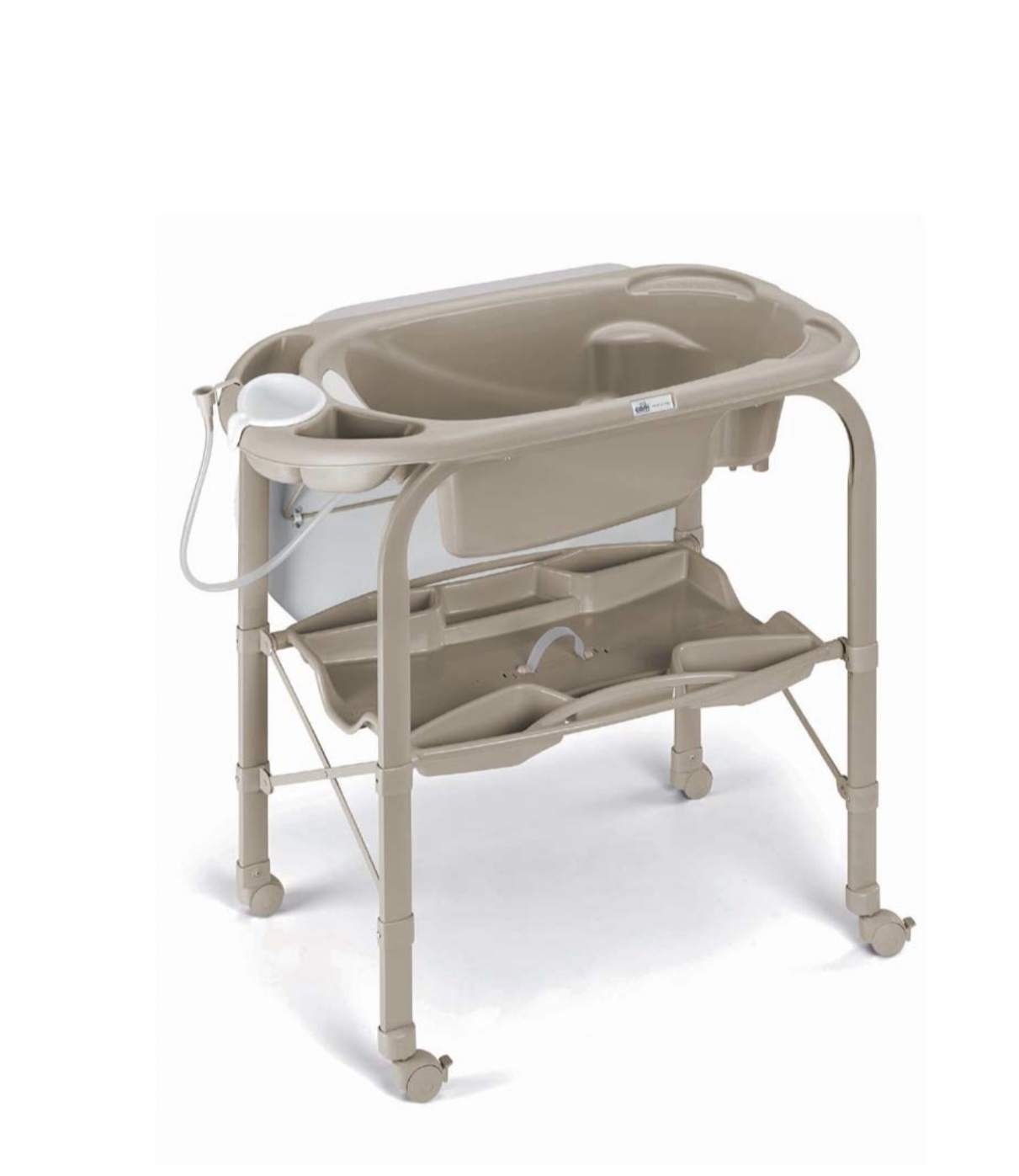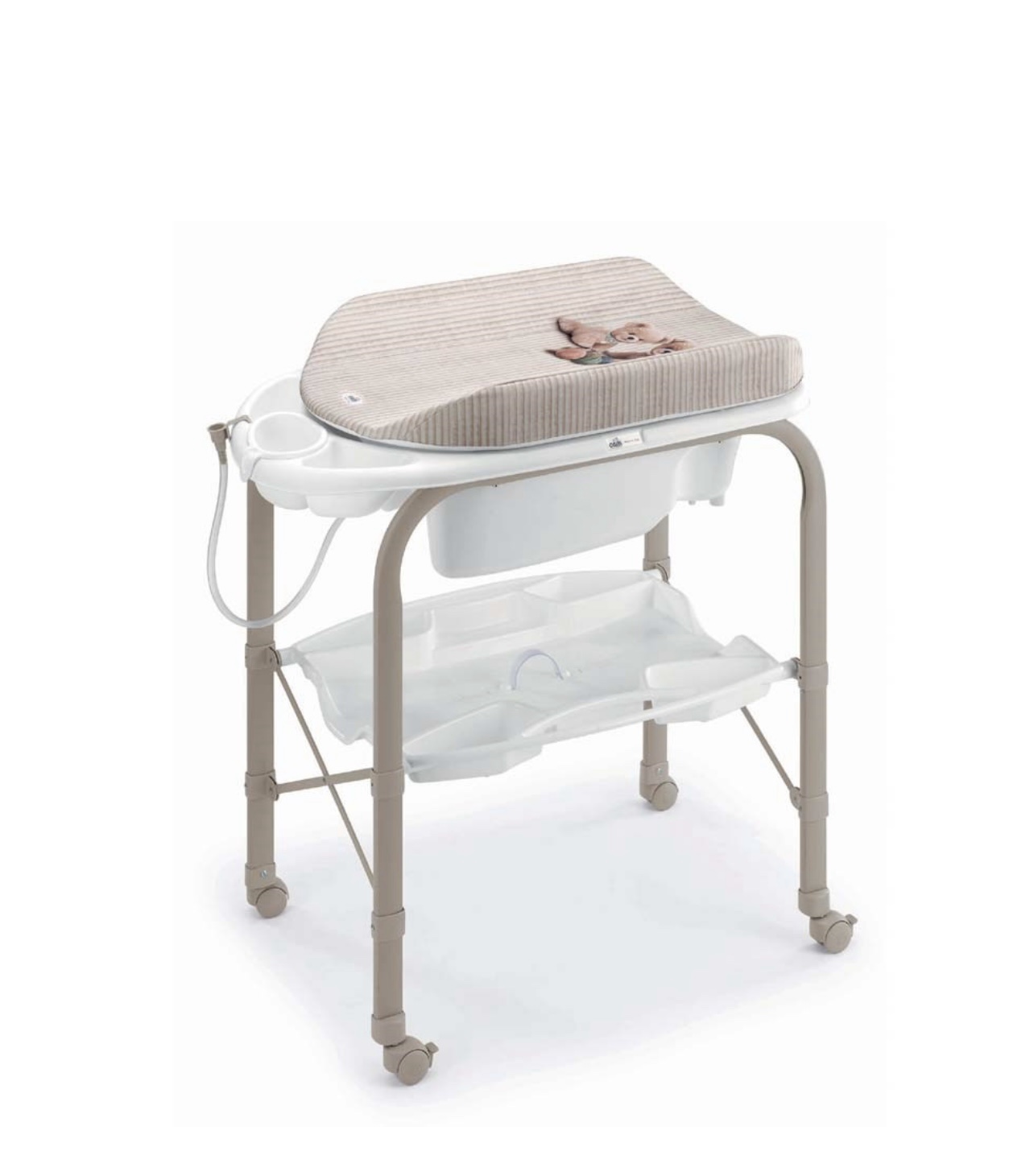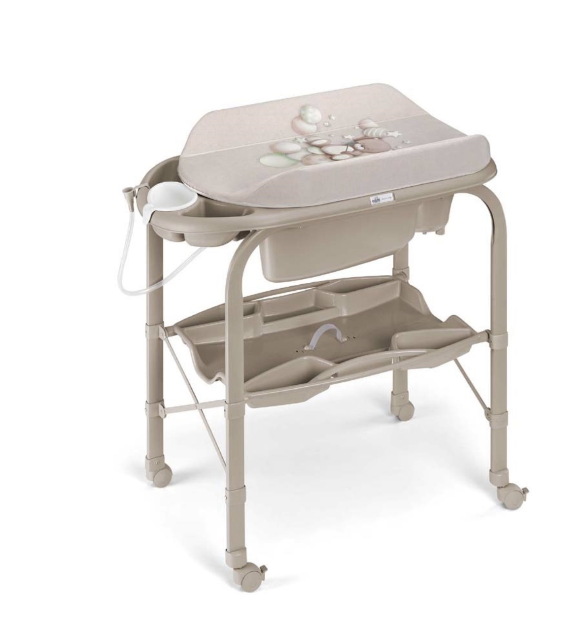 -Morbido fasciatoio con sistema di anti-ribaltamento, include vaschetta -Baby Bagno con 2 sedute anatomiche e antiscivolo (una inclinata per -bimbi da 0 a 6 mesi e una seduta con braccioli per bimbi da 6 a 12 mesi)