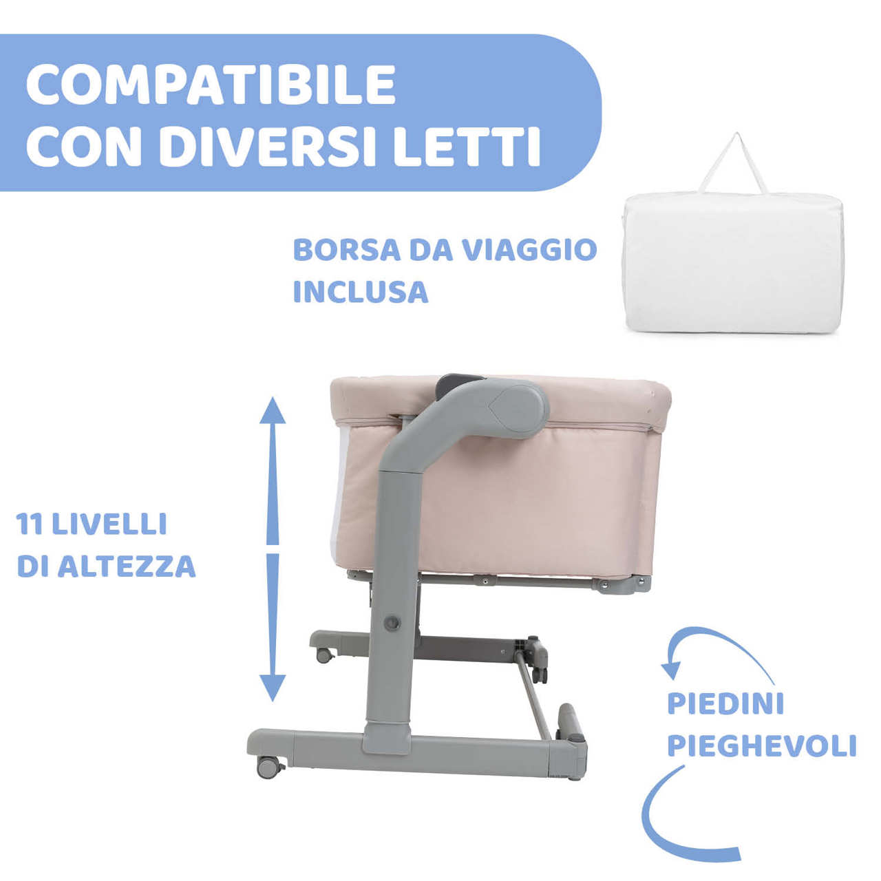 • Compatibile con la maggior parte dei letti grazie alle 11 regolazioni dell’altezza e ai piedini pieghevoli
