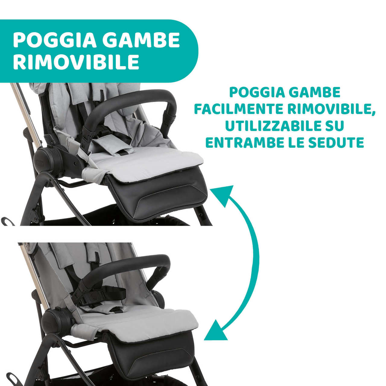 Il secondo seggiolino di One4ever può essere utilizzato con o senza poggiagambe, per assecondare le esigenze di ogni bambino. È possibile rimuovere il poggiagambe dal primo seggiolino e montarlo in modo semplice e veloce sulla seconda seduta.