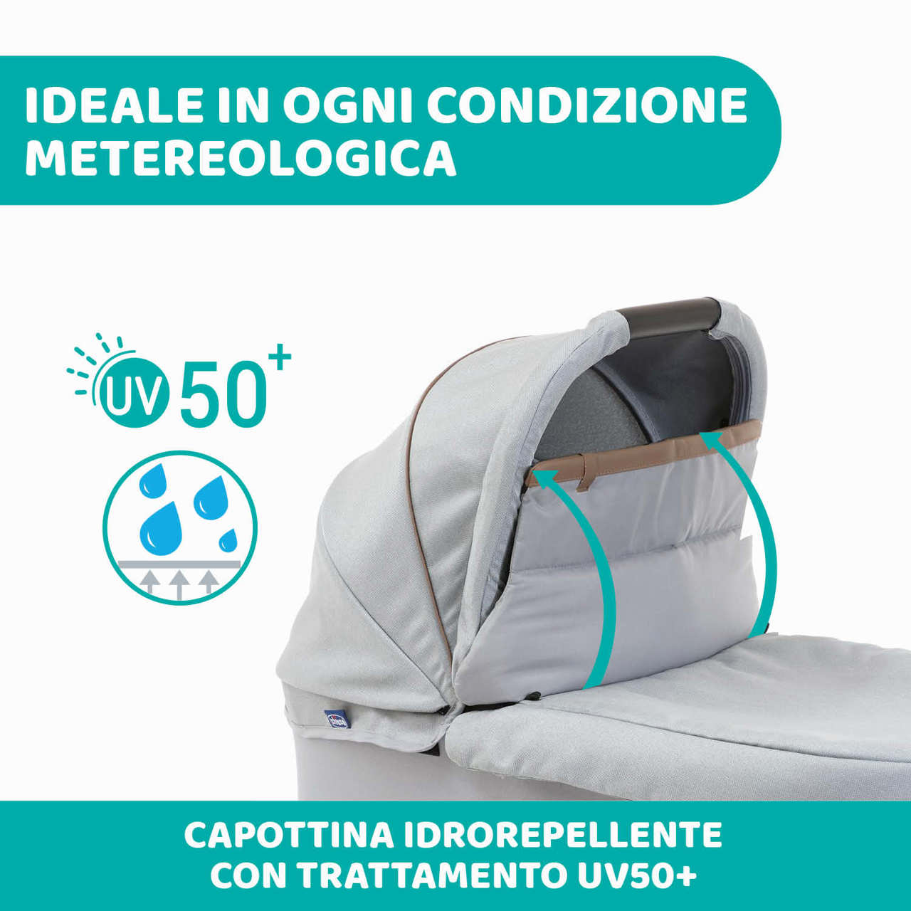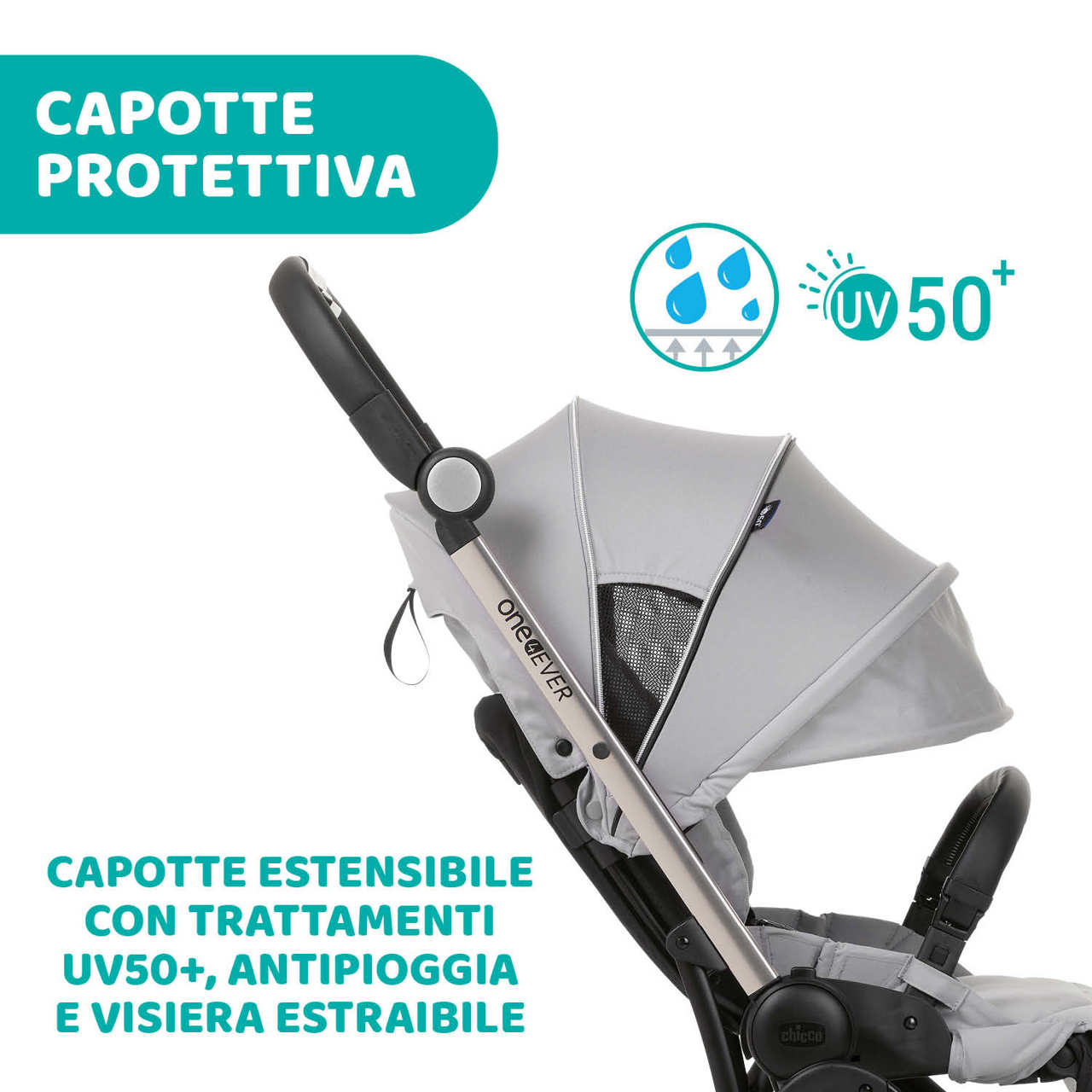 La capottina con segmento estensibile e visiera garantisce massima protezione, grazie anche ai trattamenti UV50+ e antipioggia.