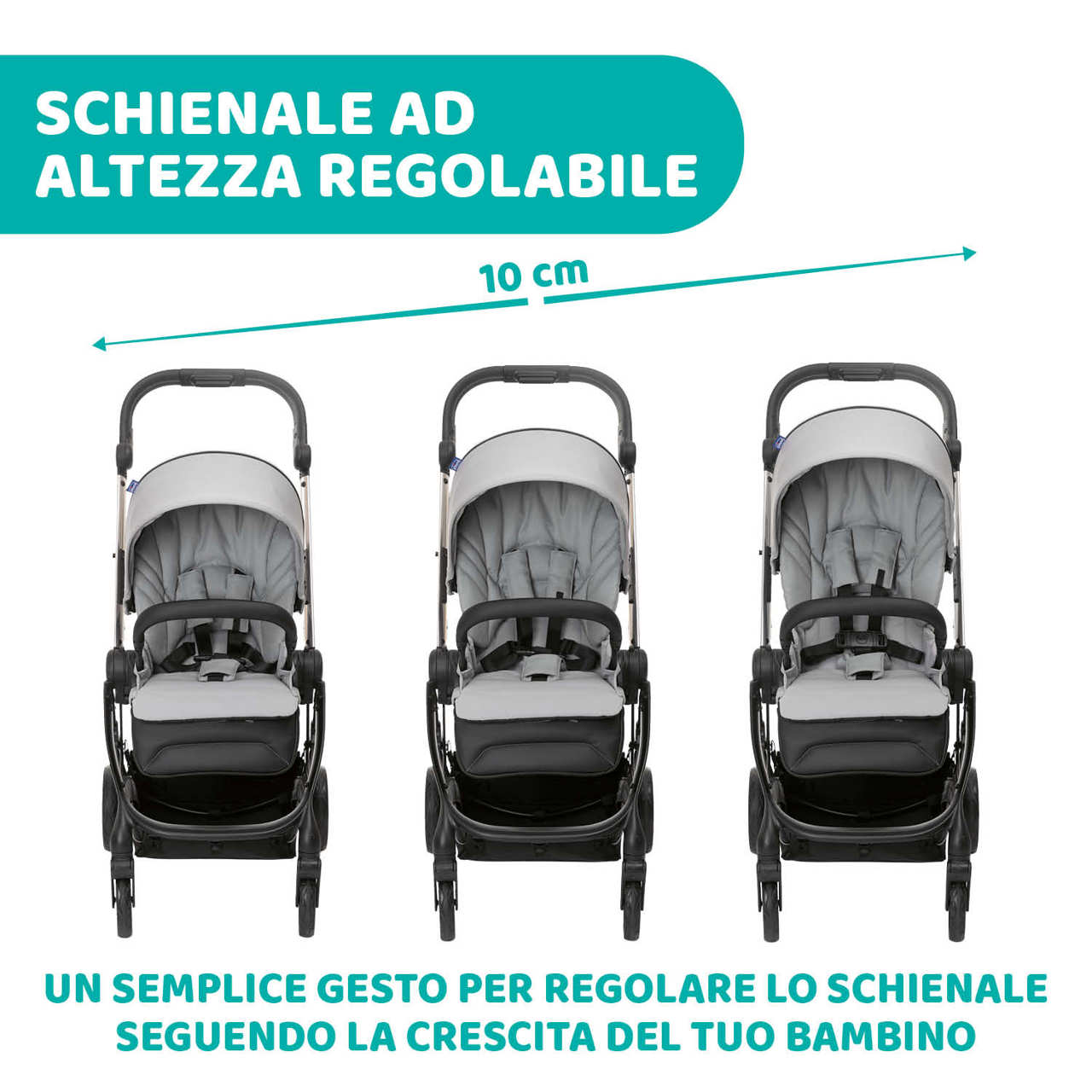 Lo schienale della prima seduta è regolabile con un semplice gesto in 3 diverse altezze, per adattarsi perfettamente ad ogni fase della crescita del bambino. Campo di regolazione: 10 cm. Le bretelle sono regolabili insieme allo schienale.