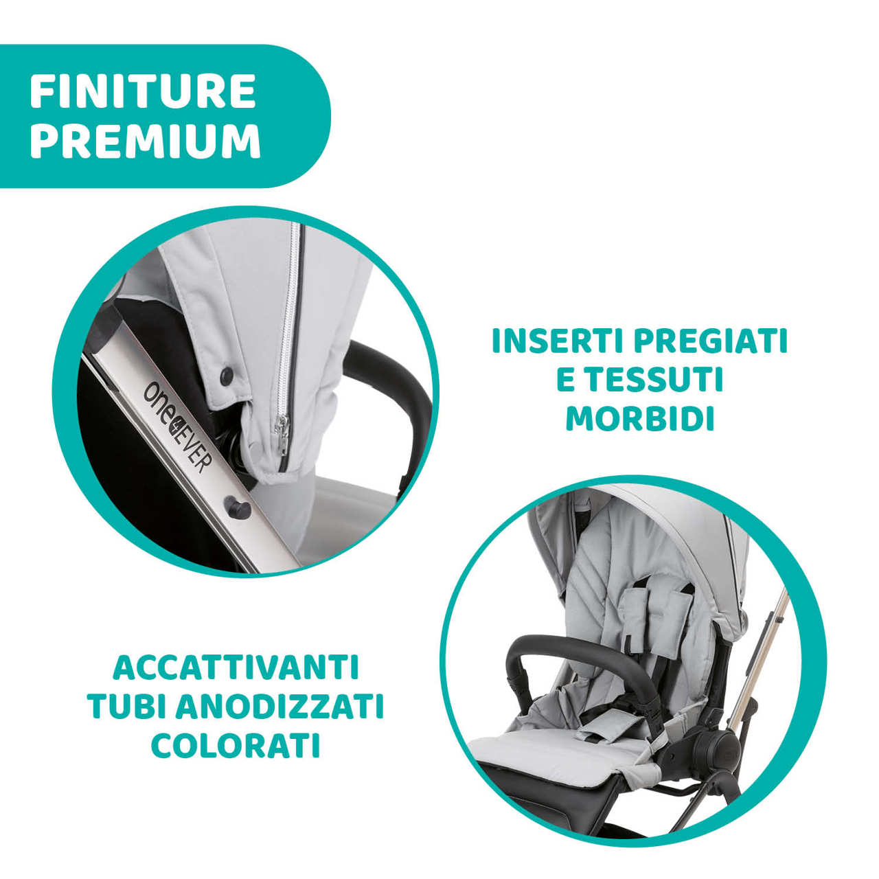- Un solo telaio, due diverse sedute: il passeggino One4Ever permette di seguire la crescita del bambino dalla nascita fino ai 4 anni. Ha una seduta evolutiva che permette di regolare, con un semplice gesto, l’altezza dello schienale in 3 diverse posizioni